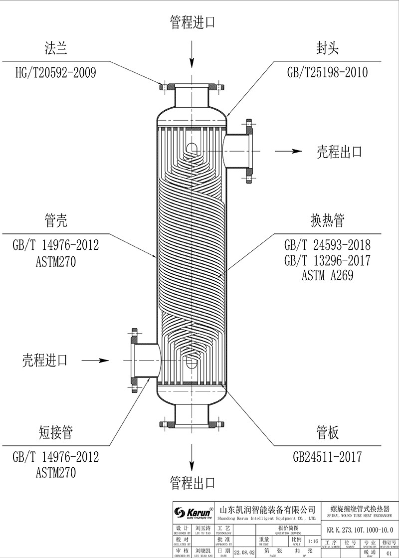 2.非對稱流設(shè)計:螺旋纏繞管式換熱器管程與殼程容積不相同,殼程容積能達到管程容積的 4.2 倍,以滿足醫(yī)藥,化工等各種不同復(fù)雜工況要求。