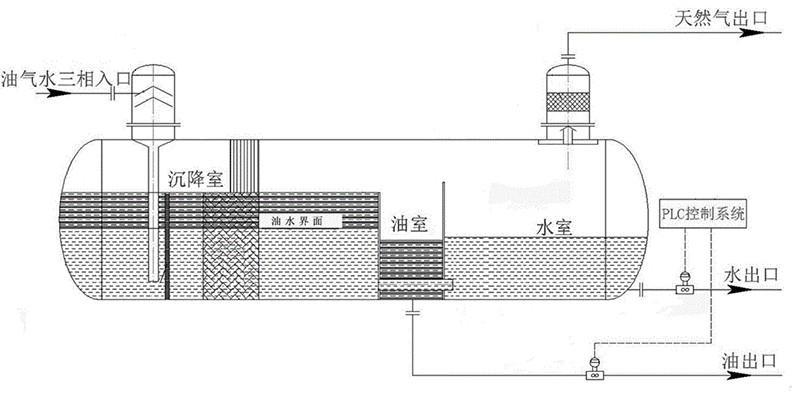 三相分離器由分離筒體、捕霧器、布液板、反射板、聚結(jié)填料、分程隔板、導(dǎo)水管、液位計(jì)、安全閥、液位控制閥等附件構(gòu)成,具有工藝簡單,投資少,便于管理和維護(hù),指標(biāo)穩(wěn)定可靠的特點(diǎn),有利于實(shí)現(xiàn)原油處理工藝密閉。